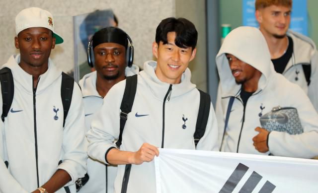 손흥민(가운데)과 토트넘 선수단이 1일 오후 인천국제공항 제1터미널을 통해 입국해 팬들을 향해 인사하고 있다. 토트넘은 오는 3일 오후 8시 서울 월드컵경기장에서 뉴캐슬 유나이티드와 친선전을 치른다. 뉴시스 |