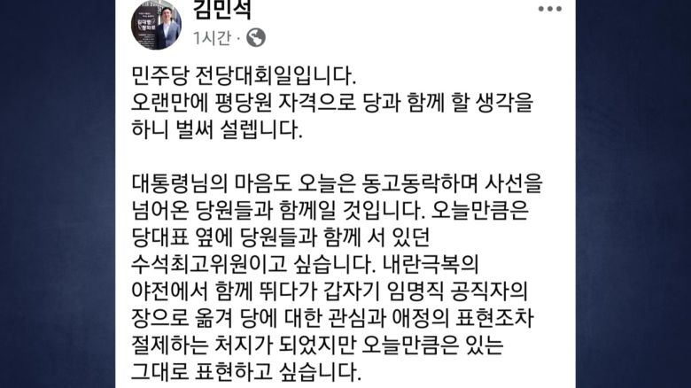 김민석 국무총리는 더불어민주당 새 대표를 뽑는 전당대회를 앞두고, 이재명 대통령의 마음도 동고동락하며 사선을 넘은 당원들과 함께일 것이라고 말했습니다.
