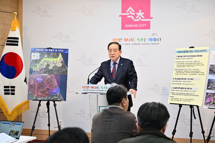 지난 3월 접경지역 지정 확정 당시 기자회견을 하고 있는 이변선 속초시장. 속초시 제공 |