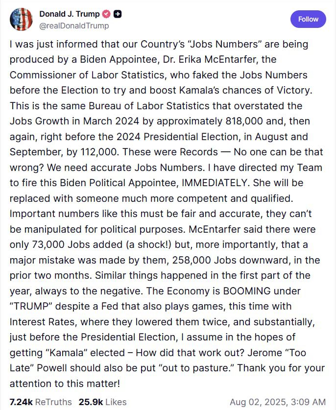 트럼프는 “7월 고용이 고작 7만3000명 증가했고, 5~6월 수치는 무려 25만8000명이나 하향 조정됐다”며 “이는 정치적 조작이자, 맥엔타퍼의 중대한 실수”라고 비난했다. 이어 “공정한 통계는 민주주의의 기반이다. 내 팀에 그녀의 즉각 해고를 지시했으며, 훨씬 더 유능하고 정직한 인물로 대체할 것”이라고 밝혔다.