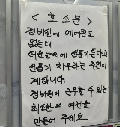 경비원이 작성한 것으로 보이는 호소문에는 "경비실에 에어컨도 없는데 더운 날씨에 선풍기 튼다고 선풍기 치우라는 주민이 있다. 경비원이 근무할 수 있는 최소한의 여건을 만들어 달라"는 내용이 담겼다.