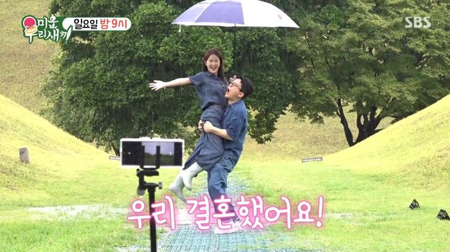 특히 김준호와 김지민은 경주 유적지에서 신혼여행 스냅 사진을 찍기도 했다. 타이머를 맞춰두고 달려가 포즈를 취하면서 달달함을 자아낸 가운데 김준호가 김지민을 번쩍 안는 모습도 보여 설렘을 증폭시켰다. 하지만 힘에 부친 김준호는 버거워했고, 김지민은 “너무 X구멍 만지는 거 아니야”라고 민망해해 웃음을 자아냈다.