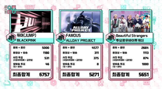 2일 방송된 MBC '쇼! 음악중심'에서는 블랙핑크(BLACKPINK) '뛰어'가 올데이프로젝트(ALLDAY PROJECT) 'FAMOUS', 투모로우바이투게더 'Beautiful Strangers'를 딛고 8월 첫째주 1위를 차지했다.