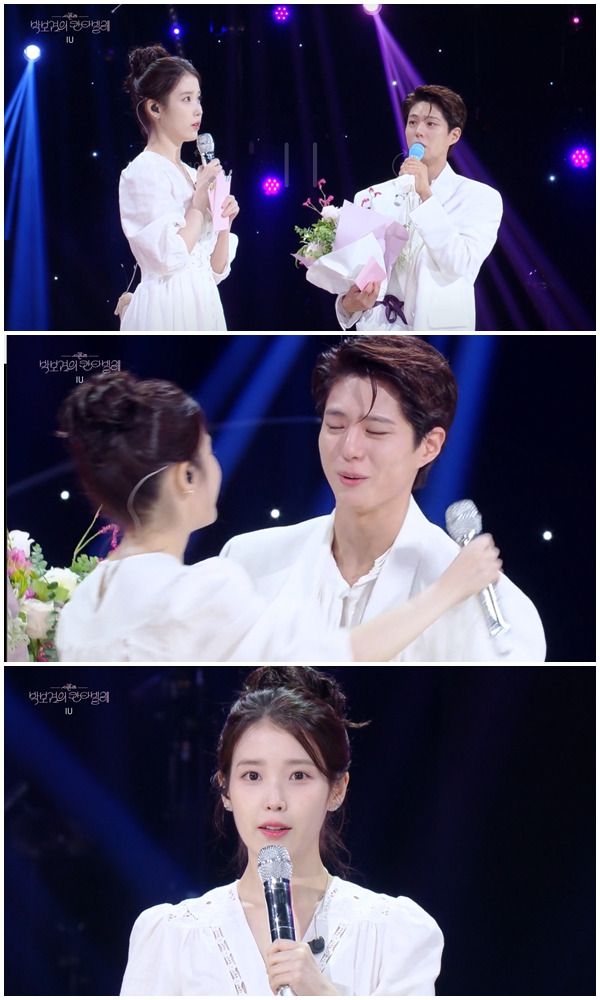 아이유는 영상 편지를 통해 "꼭 게스트로 가겠다고 약속 했는데 못 지켜서 미안하다"며 "너무 미안해서 내가 왔다"고 말했다. 그러면서 대형 꽃다발을 들고 무대 위 박보검에게 달려갔다.