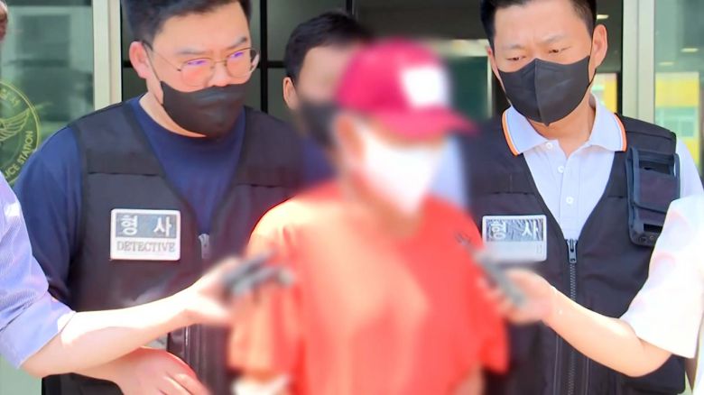 빨간 모자와 흰 마스크를 쓴 남성이 양팔을 붙들린 채 경찰서를 나섭니다.