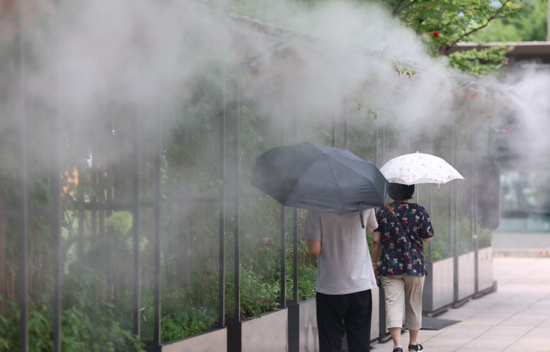 무더위가 이어진 1일 시민들이 서울 중구 서울시청 앞 쿨링포그를 지나고 있다. /뉴스1 |