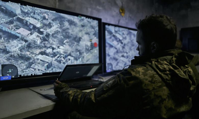 드론에서 송신된 영상을 보고 있는 우크라이나 병사. AP연합뉴스