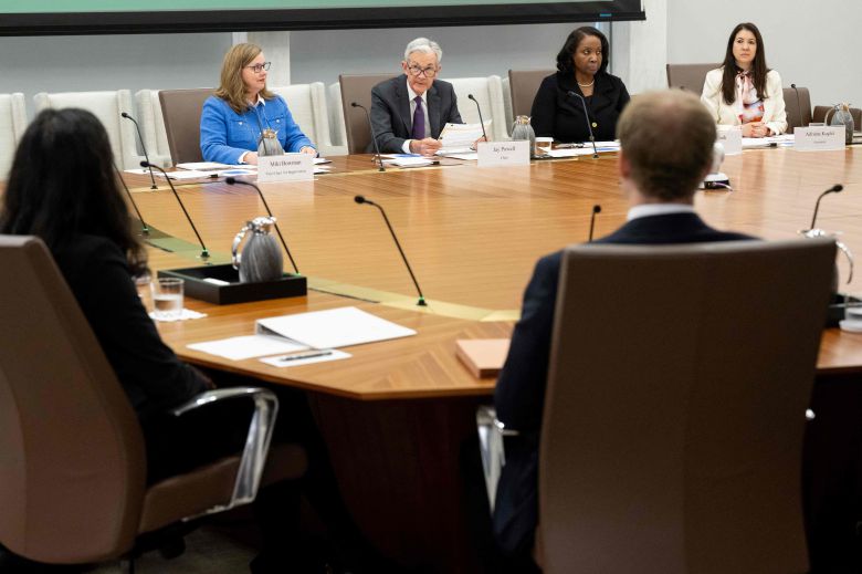 지난 6월 미국 워싱턴 DC에서 열린 연방준비제도 회의에서 제롬 파월 의장(가운데)이 발언하고 있다. 아드리아나 쿠글러 연준 이사(가장 오른쪽 흰색)도 참석했다./AFP 연합뉴스