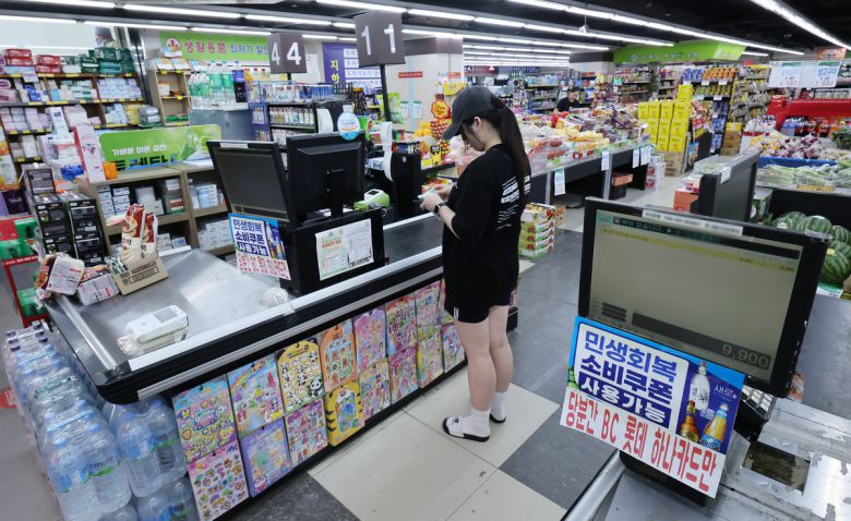 지난달 30일 서울 마포구의 한 동네 슈퍼마켓에 민생회복 소비쿠폰 사용 안내 문구가 적혀있다. 뉴스1 |