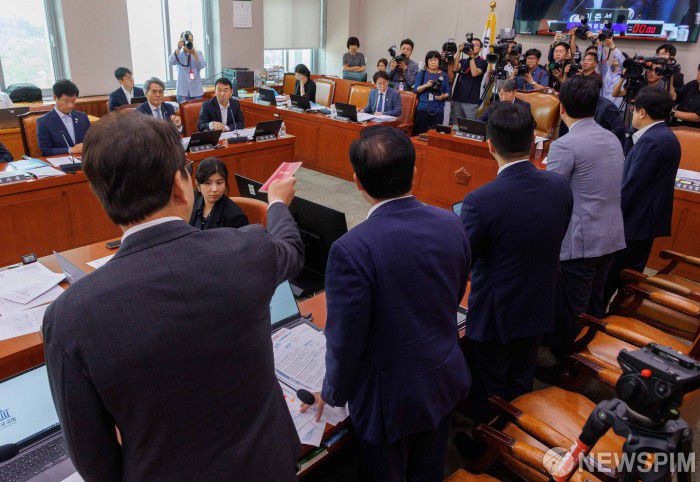 [서울=뉴스핌] 윤창빈 기자 = 국회 법제사법위원회 국민의힘 의원들이 1일 오전 서울 여의도 국회에서 열린 법제사법위원회 전체회의에서 의사진행과 관련해 이춘석 위원장에게 항의하고 있다. 2025.08.01 pangbin@newspim.com |