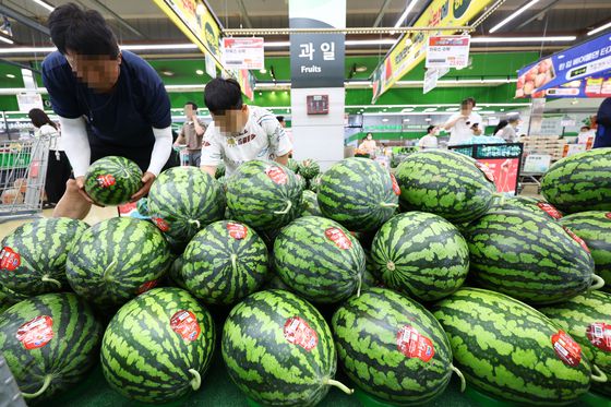 서울 한 대형마트에서 고객들이 수박을 고르고 있다. 폭염으로 인해 생육 부진 등으로 수박 등 일부 농산물 가격이 전년 대비 최대 40% 이상 오른 것으로 나타났다. 뉴시스 |