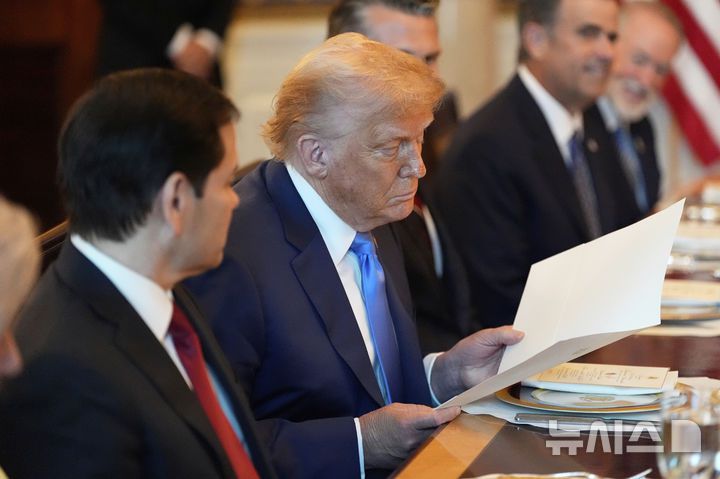[워싱턴=AP/뉴시스] 도널드 트럼프 미국 대통령이 7일(현지 시간) 워싱턴DC 백악관에서 베냐민 네타냐후 이스라엘 총리와의 만찬에서 네타냐후 총리가 전달한 서류를 보고 있다. 네타냐후 총리는 이 자리에서 트럼프 대통령을 노벨평화성 후보로 추천했다고 밝혔으며 노벨위원회에 보낸 추천 서한을 트럼프 대통령에게 전달했다. 2025.08.03. |