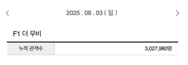 최고가 되지 못한 베테랑 드라이버 ‘소니 헤이스’가 최하위 팀에 합류해 천재적인 신예 드라이버와 함께 일생일대의 레이스를 펼치는 영화 'F1 더 무비'가 개봉 40일 차인 8월 3일(일) 오전 8시 46분 기준 개봉 누적 관객수 302만 7,980명을 기록하며 극장가 흥행 역사를 다시 쓰고 있다.