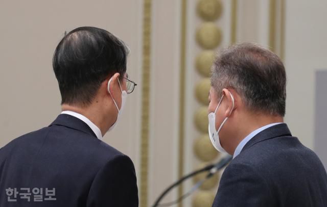 한덕수 전 국무총리와 이상민 전 행정안전부 장관이 2022년 12월 21일 청와대 영빈관에서 열린 제12차 비상경제민생회의 겸 제1차 국민경제자문회의에 참석해 얘기하고 있다. 서재훈 기자