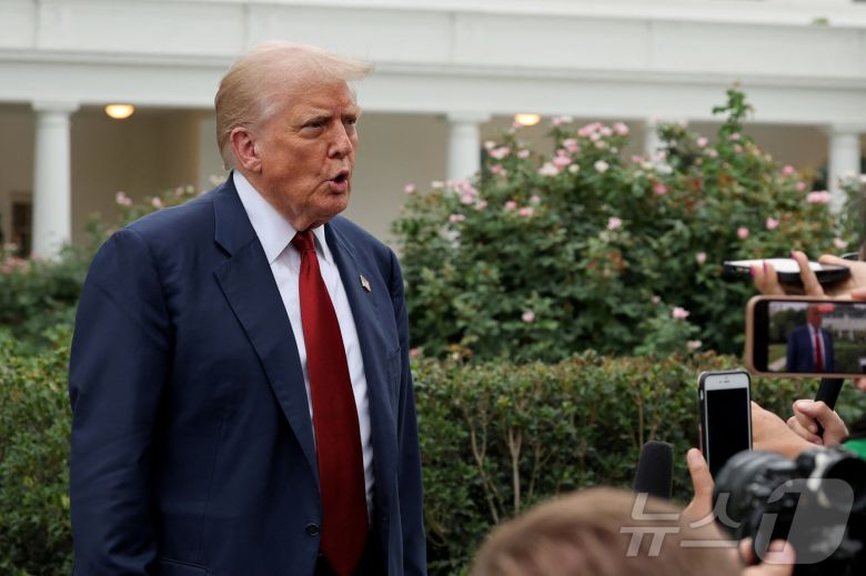 도널드 트럼프 미국 대통령이 1일(현지시간) 미국 워싱턴DC 백악관에서 뉴저지로 출발하기 위해 '마린 원'(미 대통령 전용헬기)에 탑승하기 전 기자들과 만나 질문에 답하고 있다. 2025.08.01. ⓒ 로이터=뉴스1 ⓒ News1 류정민 특파원