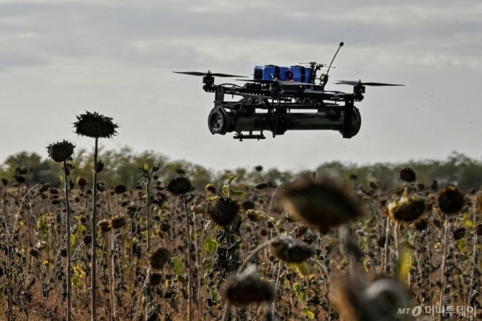 2024년 10월 11일 우크라이나 자포리자 지역 전선 인근에서 우크라이나 병사들이 포터블 유탄발사기를 장착한 드론을 시험 비행하고 있다. AI(인공지능) 기술이 적용된 드론이다. / 로이터=뉴스1 |