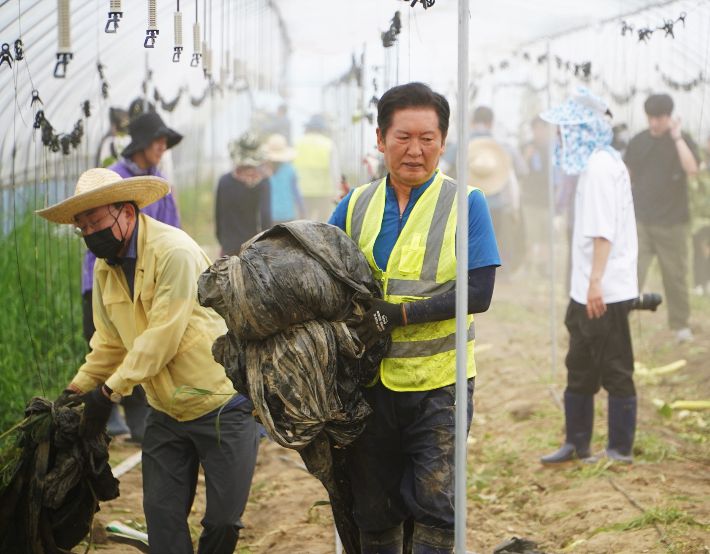 정청래 더불어민주당 신임 대표가 당선 이후 첫 공식 일정으로 나주 수해 피해 복구 현장을 찾아 힘을 보탰다. 나주시 제공 |