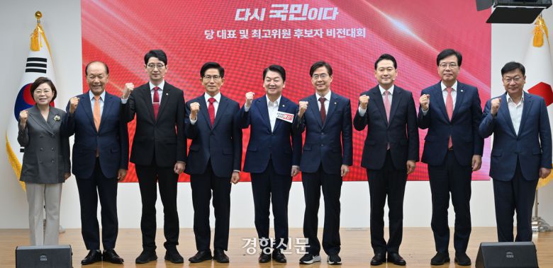 국민의힘 제6차 전당대회 당 대표 후보자 비전대회가 3일 서울 여의도 중앙당사에서 열렸다.  당 대표 후보들과 송언석 국민의힘 비상대책위원장 겸 원내대표 등 당 지도부가 포즈를 취하고 있다. 왼쪽부터 김정재 정책위의장, 황우여 선관위원장, 주진우·김문수·안철수·조경태·장동혁 후보, 송 비대위원장, 정점식 사무총장. 문재원 기자