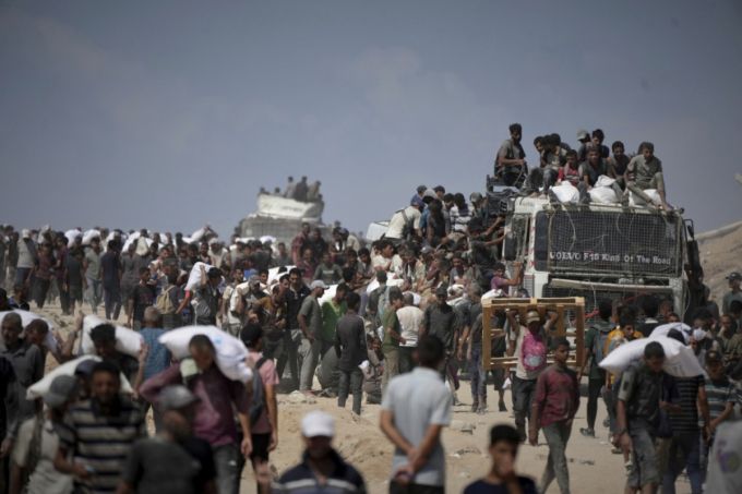 1일(현지시간) 가자지구 북부 베이트 라히야 외곽에서 팔레스타인 주민들이 가자시티로 향하던 인도적 물품 수송 트럭에서 내린 밀가루 자루를 나르고 있다. /AP=뉴시스 |