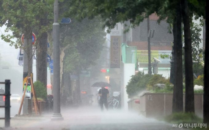 [대구=뉴시스] 이무열 기자 = 대구 지역 호우경보가 발효된 17일 대구 남구청네거리 인근에서 우산을 쓴 한 시민이 이동하고 있다. 2025.07.17. lmy@newsis.com /사진=이무열 |