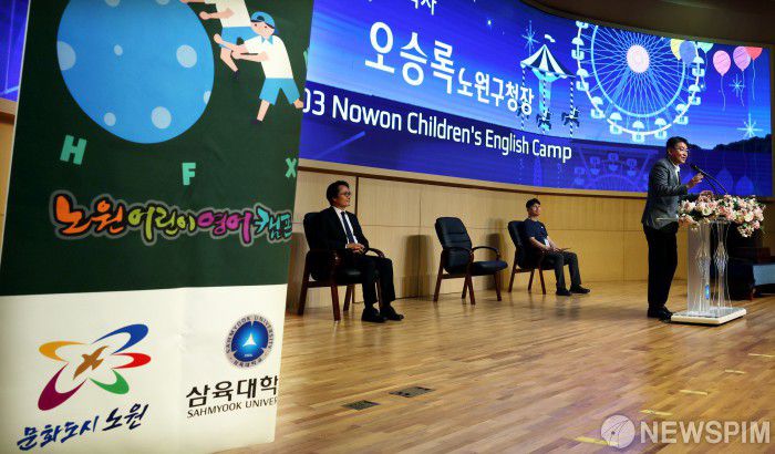 [서울=뉴스핌] 양윤모 기자 = 오승록 노원구청장이 3일 오후 서울 노원구 공릉동 삼육대학교 요한관 대강당에서 열린 ‘2025 여름방학 노원 어린이 원어민 영어캠프 퇴소식’에 참석해 인사말을 하고 있다.영어캠프는 여름방학을 활용해 초등학생들이 실제 어학연수에 준하는 환경에서 실용 영어를 배우고 다양한 문화·체육 활동을 체험하며 글로벌 감각을 키울 수 있도록 마련된 집중 체험형 프로그램이다. [사진=노원구청] 2025.08.03 yym58@newspim.com