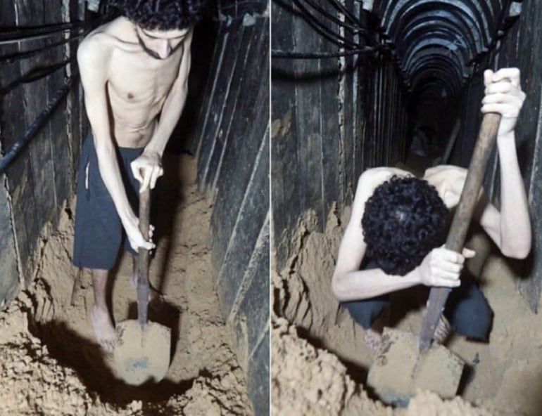 팔레스타인 무장단체 하마스에 의해 납치된 이스라엘 인질이 앙상한 모습으로 가자지구 지하터널에서 삽질하는 모습의 영상이 공개됐다. 이 포로는 “이 무덤이 제가 묻힐 곳”이라며 휴전을 호소했다.