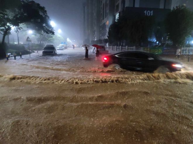 3일 오후 7~8시 전남 무안군에 시간당 140㎜가 넘는 폭우가 내린 가운데 침수된 도로를 자동차가 지나고 있다. 2025.8.3 뉴스1 |