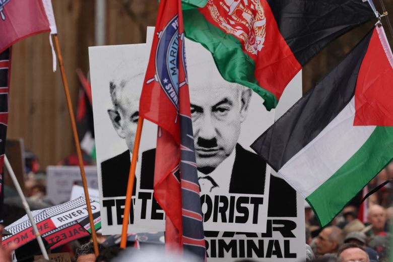 3일(현지시간) 호주 시드니에서 열린 시위에서 참가자들이 이스라엘의 가자지구 전쟁과 기아 위기에 항의하며, 베냐민 네타냐후 이스라엘 총리를 히틀러에 비유한 팻말을 들고 있다. AFP연합뉴스 |