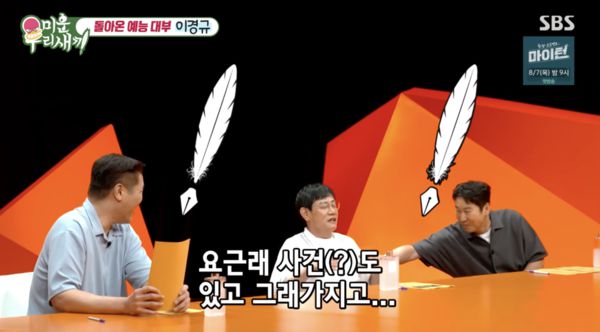 이날 신동엽은 "45년이 됐음에도 아직 해드시고 계신다. 그럼에도 뒤쳐지지 않기 위해 다양한 프로그램을 보고 계신다고 한다"라며 소개했다. 이어 이경규는 "'미우새'를 보지 않는 이유는 망한 프로그램만 보기 때문이다. 망한 프로그램을 보면 자신감이 생긴다"라고 말해 웃음을 자아냈다.