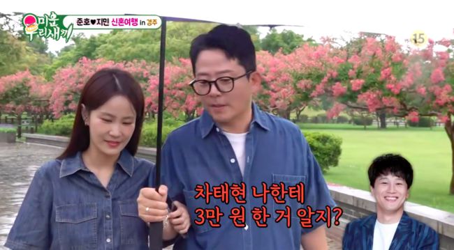 그러자 김준호는 “근데 차태현 나한테 3만원 낸 거 알지?”라고 물었다. 김지민은 “나머지 큰 금액은 다 나한테 한 거 알지?”라고 했고, 김준호는 “원래 차태현 정도면 자기한테 큰 금액을 하고 나한테는 몰래 줘야지. ‘비상금으로 써’ 왜 큰 금액을 너한테 내고 나한테 3만원 내냐”라고 불만을 토로했다.
