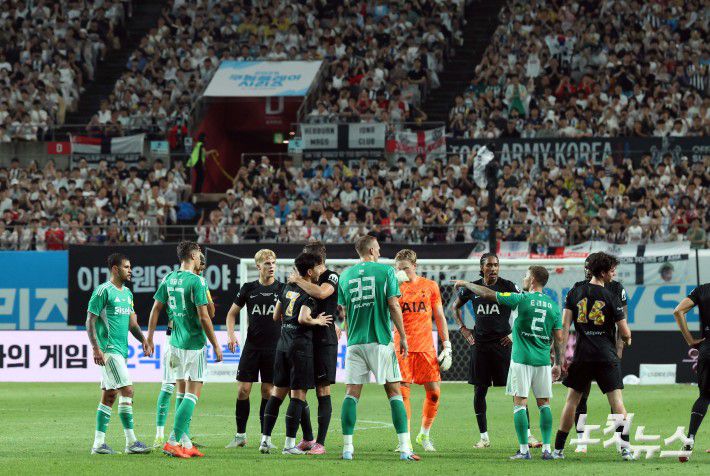 토트넘 손흥민이 3일 오후 서울 마포구 월드컵경기장에서 열린 ‘2025 쿠팡플레이 시리즈’ 프리미어리그 토트넘과 뉴캐슬의 경기에서 교체되며 양팀 선수들의 격려를 받고 있다.