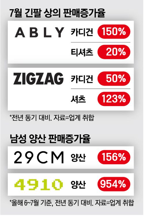 지그재그 관계자는 “7월 들어 폭염이 지속되면서 뜨거운 햇빛으로부터 피부를 보호하고, 차가운 에어컨 바람을 막아주는 긴소매 상의 수요가 급증했다”며 “쉽게 입고 벗을 수 있는 카디건, 셔츠 거래액 증가가 두드러졌다”고 분석했다.