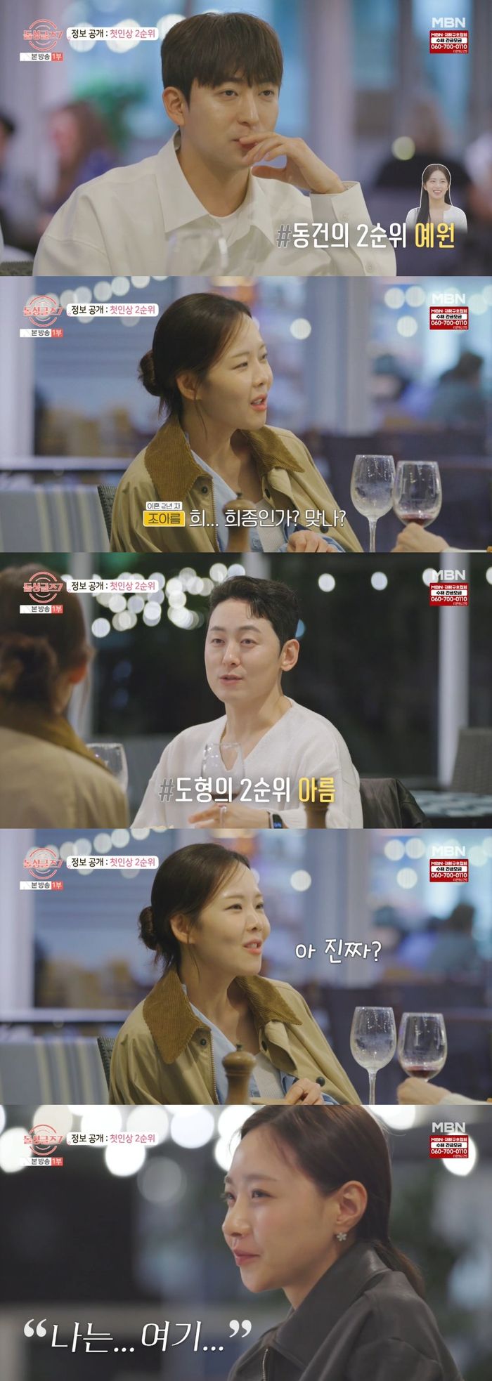 이때 네 사람에게 ‘어제 인터뷰에서 말한 첫인상 2위를 공개하라’는 문자가 왔다. 동건은 “내가 먼저 이야기할까? 어제 2순위는 예원이었어”라고 했다. 아름은 “사실 어제 모든 남자하고 이야기해본 적 없어. 2순위는 희종인가 맞나?”라며 자리에 없는 이름을 말했다.
