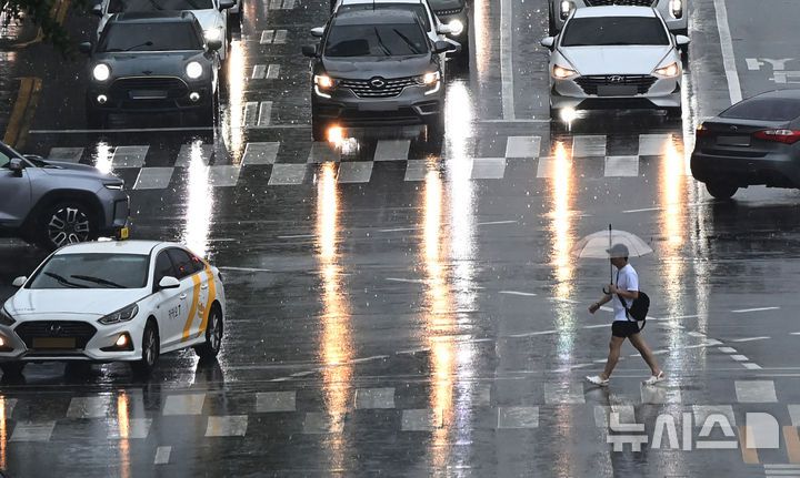 [수원=뉴시스] 김종택 기자 = 수도권 등 중부지역에 호우주의보가 발효된 16일 경기 수원시 팔달구 경수대로에서 한 시민이 우산을 쓰고 이동하고 있다. 2025.07.16. jtk@newsis.com