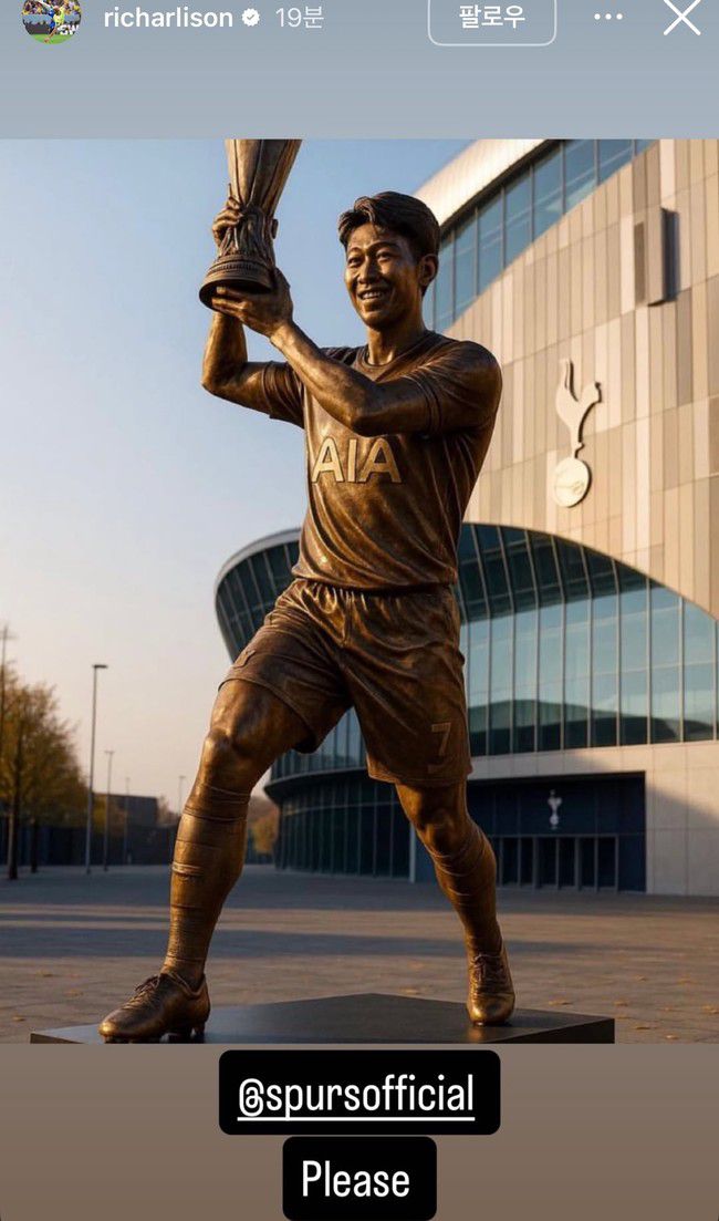 떠나는 전설을 향해 토트넘 선수들은 예우를 표했다. 히샬리송은 개인 SNS에 손흥민 동상 AI 사진을 올리며 "제발"이라고 덧붙였다. 손흥민 동상을 토트넘이 건립해야 한다고 주장한 것이다. 장난스럽게 말하면서도 진심이 느껴졌다. 손흥민을 향한 존경심이 담겨져 있었다.