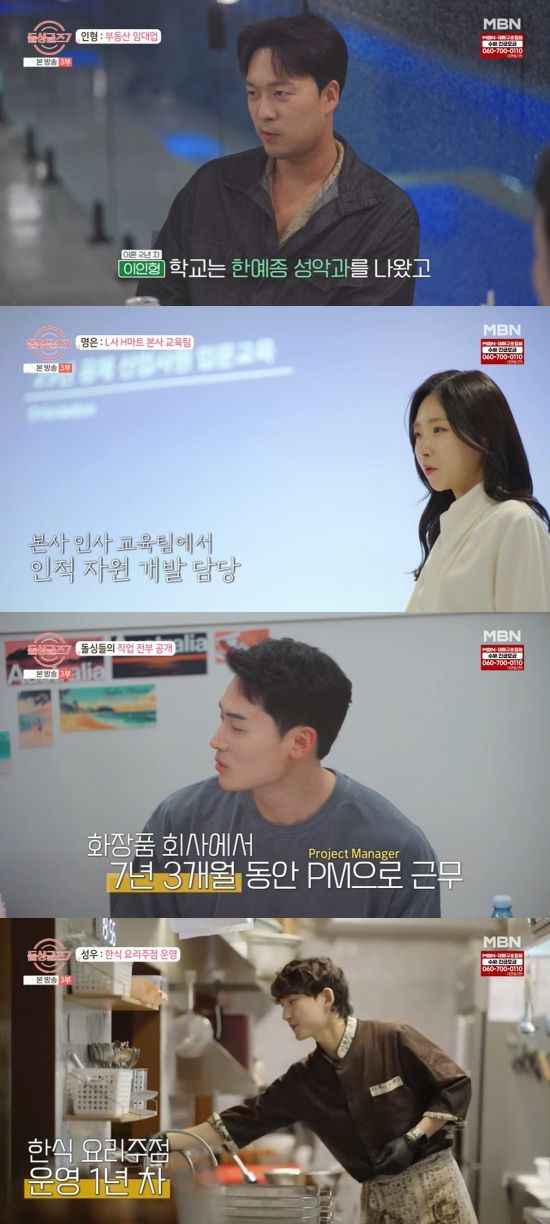3일 방송된 MBN '돌싱글즈7'에서는 돌싱남녀 10인 도형-동건-명은-성우-수하-아름-예원-인형-지우-희종의 두 번째 정보인 직업 공개가 그려졌다.
