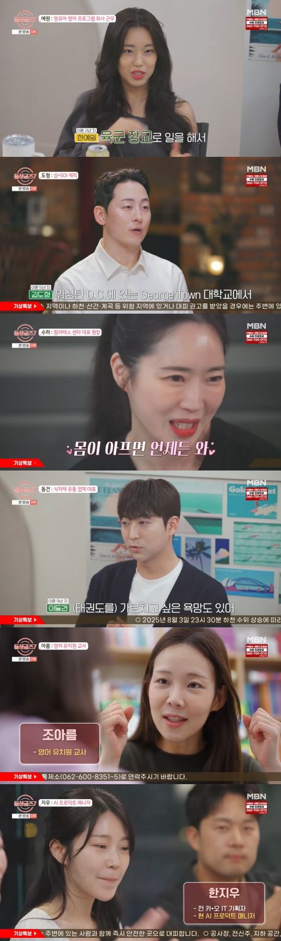 아름은 영어 유치원 교사로 원어민 선생님과 한 교실에서 아이들을 관리하는 일을 하고 있다고 밝혔다. 지우는 IT 스타트업 AI 프로덕트매니저였다. 지난해까지 카*카오에서 PM으로 일했고 현 직장으로 이직해 새로운 도전 중이라고 알렸다.