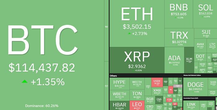 [디지털투데이 AI리포터] 4일 오전 7시 30분 코인360을 기준으로 글로벌 암호화폐 시장이 일제히 상승세를 보이며 전날 하락 분위기에서 빠르게 반등했다. 비트코인(BTC)은 전일 대비 +1.35% 상승한 11만4437.82달러를 기록하며 다시 11만4000달러대를 회복했다.