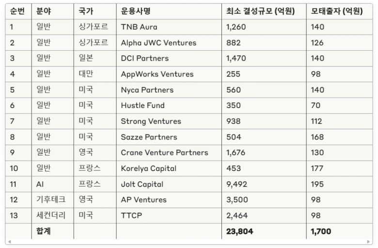 이번에 선정된 13개 펀드의 총 결성규모는 2.4조원으로 역대 최대다. 이 중 AI 전문 펀드인 Jolt Capital이 약 1조원으로 가장 큰 규모를 차지한다. 모태펀드가 1,700억원을 출자하면 한국기업에 대한 의무 투자금액은 2,700억원 이상이 될 전망이다.