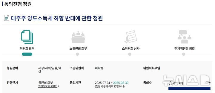 국회 전자 청원 사이트에 올라온 '대주주 양도소득세 하향 반대' 국민 동의 청원은 4일 오전 9시 기준 11만7153명이 동의했다. 지난달 30일 청원이 올라온지 나흘 만이다. 청원 동의기간은 오는 30일까지로 동의자는 더 증가할 수도 있다