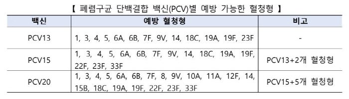 현재 국가예방접종사업(NIP)으로는 소아 폐렴구균 예방접종에 13가 단백결합백신(이하 'PCV13')과 15가 단백결합백신(이하 'PCV15')을 지원하고 있는데, 지난해 10월 식품의약품안전처의 허가를 받은 PCV20은 예방접종전문위원회에서 백신의 안전성, 면역원성, 비용-효과성 등을 종합적으로 검토해 도입이 결정됐다.