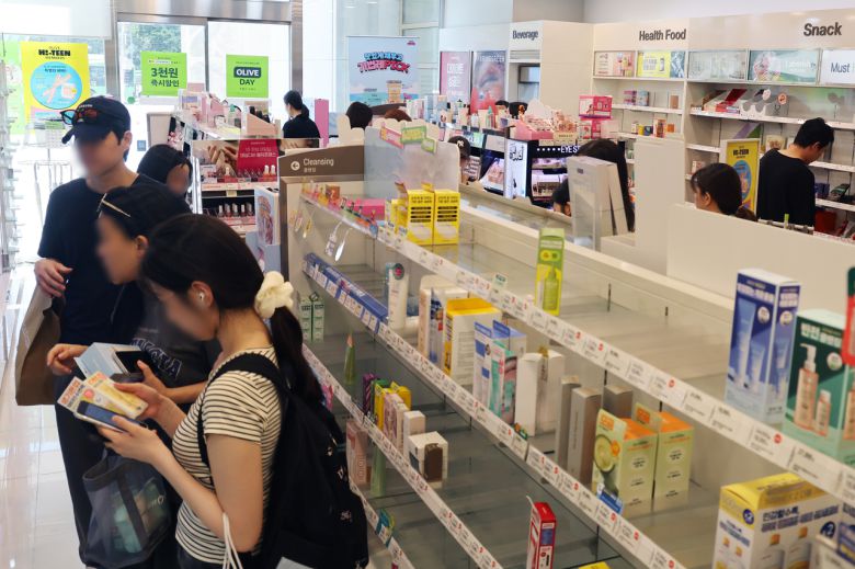 서울 시내 한 올리브영 가맹점 진열대가 텅 비어 있다. [연합]