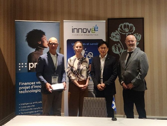IITP, INNOVEE, PROMPT가 업무 협약서 서명 후 기념사진을 촬영하고 있다. 좌측부터 PROMPT 도미니크 생루이 대표(직무대행), INNOVEE 막심 두셋 COO, IITP 신준우 본부장, 캐나다 퀘백 경제혁신에너지부(MEIE) 마르코 블루앵 총괄국장이다. 사진=IITP |