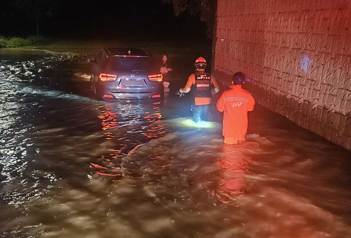 [담양=뉴시스] 3일 오후 전남 담양군의 한 도로에 폭우로 차량이 물에 잠겨 소방당국이 배수조치를 하고 있다. (사진=전남도소방본부 제공) 2025.08.04. photo@newsis.com *재판매 및 DB 금지