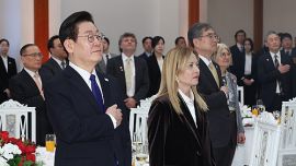 한국 온 伊 멜로니 총리, 李대통령이 선물한 ‘Z플립’으로 셀카