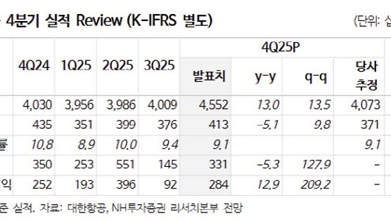 NH투자증권은 16일 대한항공(003490)에 대해 성수기 효과로 국제선 및 항공 화물 운임이 상승했으나, 영업비용 증가와 자회사 실적 둔화 부담이 지속되고 있다고 진단했다. 투자의견은 ‘매수(Buy)’를 유지하고 목표주가는 기존 대비 3% 하향한 2만9000원으로 제시했다. 정연승 NH투자증권 연구원은 “자회사 실적 둔화 및 비용 상승 부담을 고려해 2025년과 2026년 실적 추정치를 각각 33%, 26% 하향 조정했다”며 “적용 상각전영업이익(EV/EBITDA) 밸류에이션은 5.8배로 글로벌 항공사 평균 수준을 적용했다”고 설명했다. 단기 리스크 요인으로는 아시아나항공의 장거리 노선 운임 하락을 지목했다. 정 연구원은 “주가 반등을 위해서는 환율 하락 또는 아시아나항공과의 통합을 통한 수익성 안정화가 요구된다”며 “다만 통합 영업은 2026년 동계 스케줄부터 가능해 수익성 안정화까지는 시간이 필요하다”고 짚었다. 2025년 4분기 별도 기준 실적에 대...