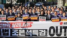 [서울=뉴시스] 류현주 기자 = 국민의힘은 30일 서울 서초구 서울고등검찰청에 마련된 조은석 내란특검 사무실 앞에서 긴급 현장- 2025.10.30 10:35