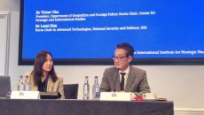 빅터 차 미국 전략국제문제연구소(CSIS) 한국 석좌(오른쪽)가 14일(현지시간) 영국 런던 국제문제전략연구소(IISS)에서- 2026.04.15 06:30