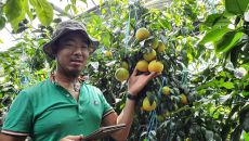 15일 제주 서귀포시 남원읍 한남리 ‘배또롱감귤농장’. 비닐하우스 안에선 한라봉과 천혜향을 교배해서 만든 품종인 황금향 열매가- 2019.08.19 19:10