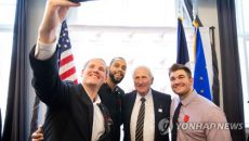 대형테러를 막은 공로를 인정받아 프랑스 국적을 부여 받은 미국 청년들 스펜서 스톤(맨 왼쪽), 앤서니 새들러(왼쪽서 두번째),- 2019.02.01 19:51